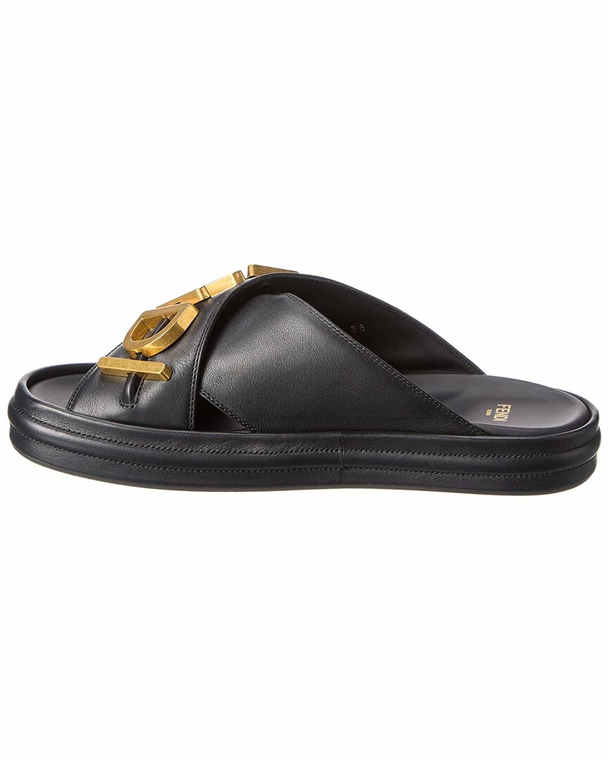 - Fendigraphy Leather Sandal in black leather and gold-tone hardware with logo accent