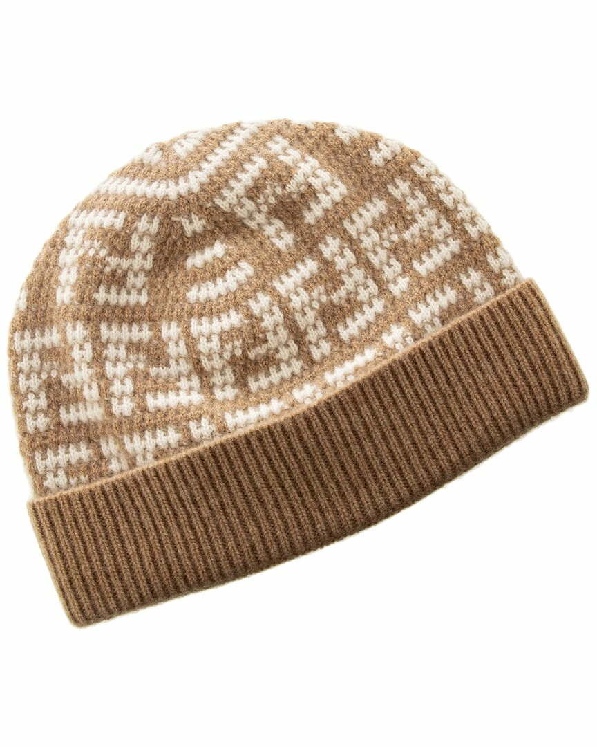 - FF Jacquard Cashmere Beanie in brown with contrasting FF jacquard motif and ribbed turn-up