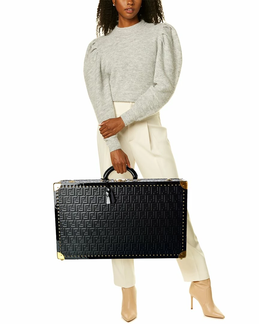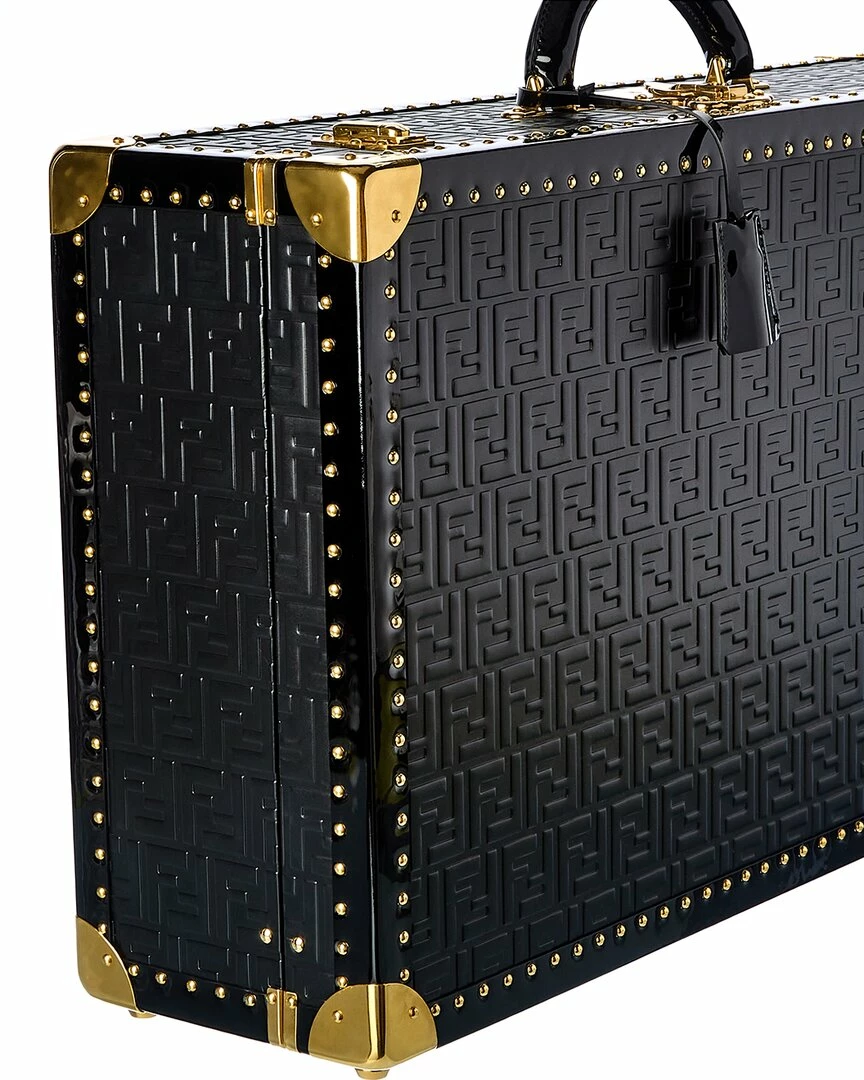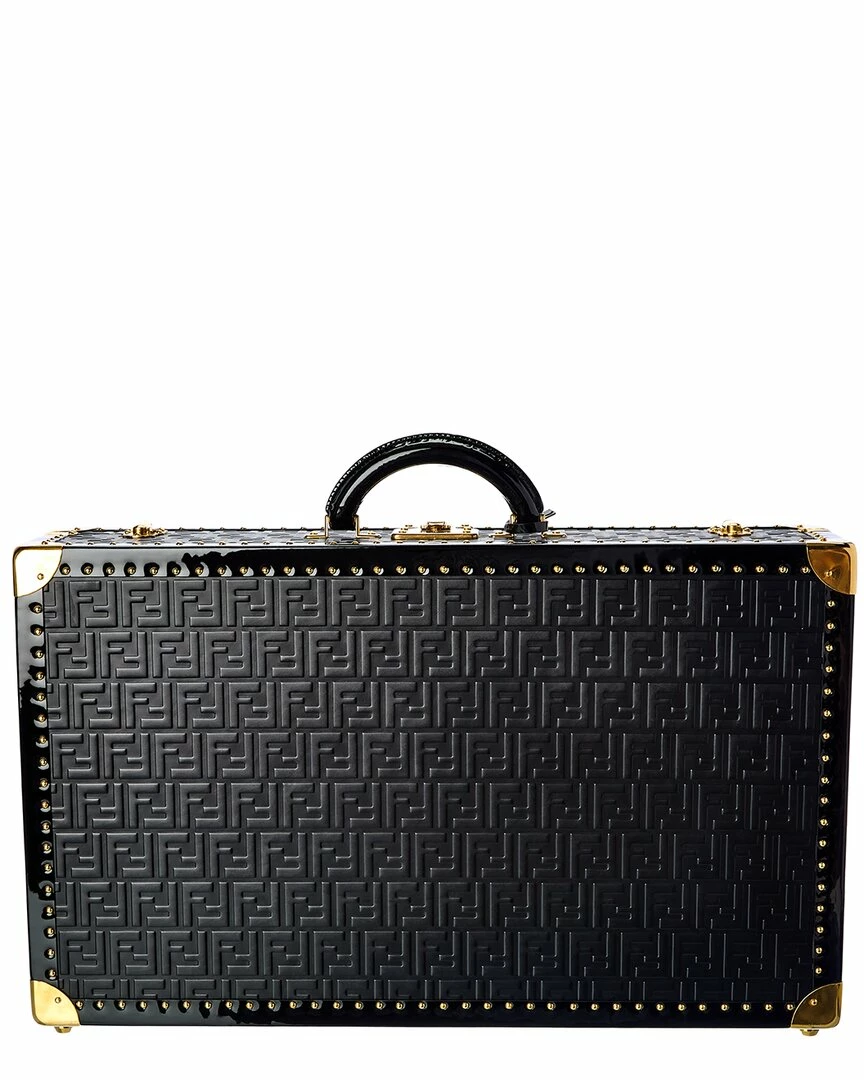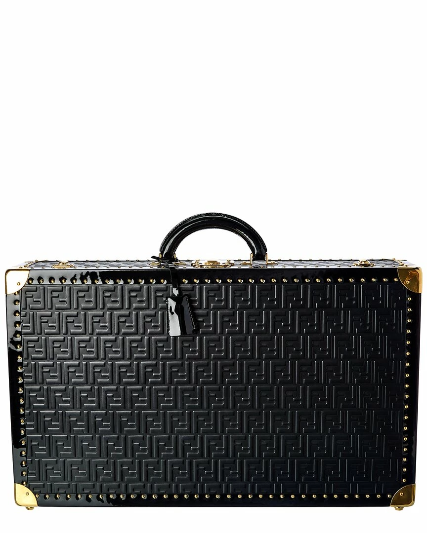 - FF Motif Rigid Large Leather Travel Trunk in black FF motif leather and gold-tone hardware with stud embellishments and mini key charm