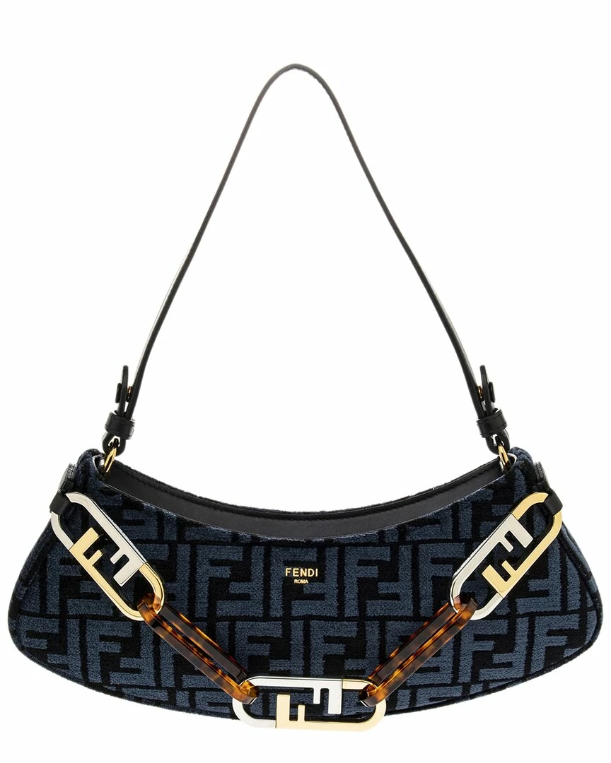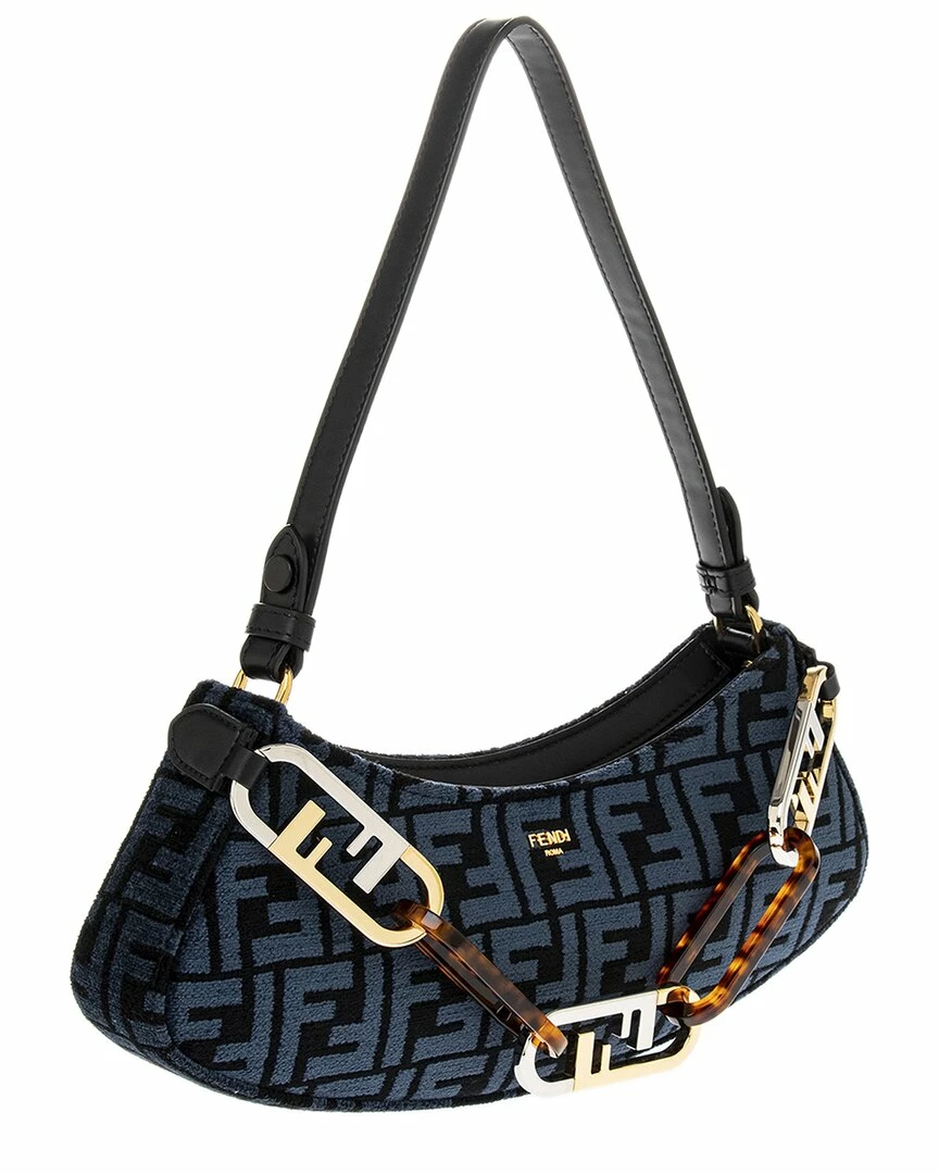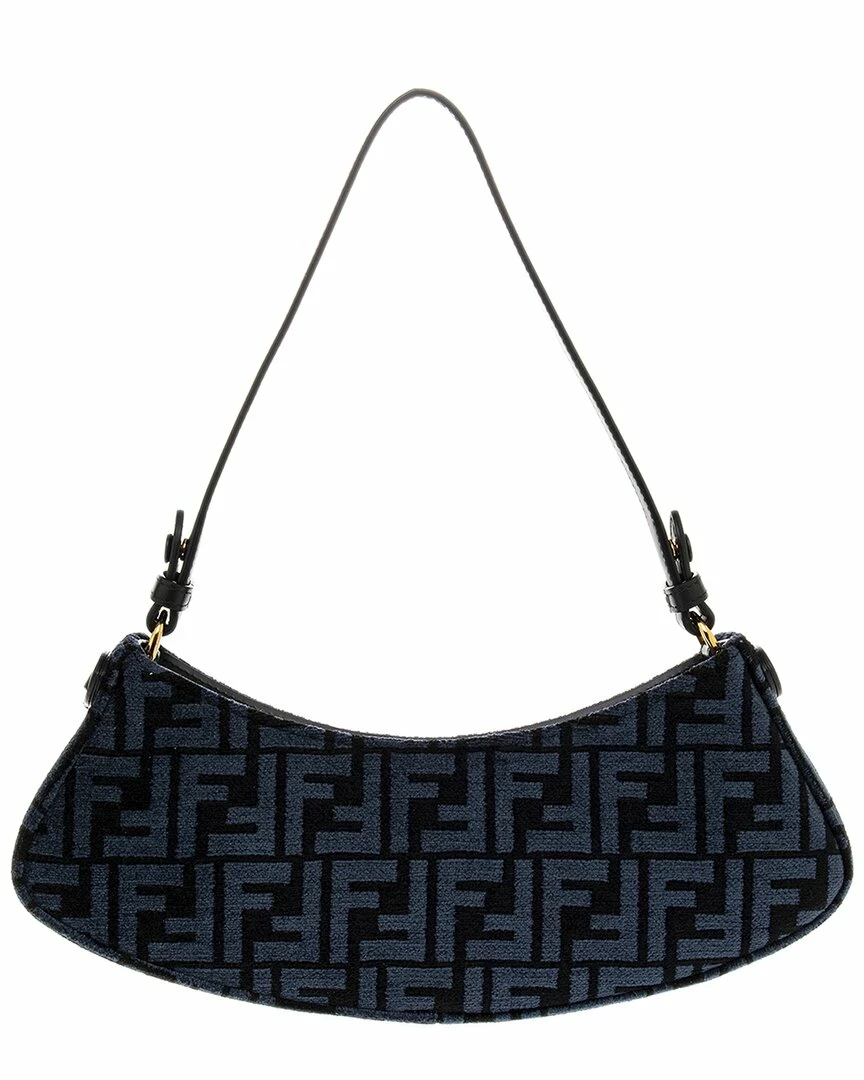 - FF O’Lock Swing Shoulder Bag in blue and black viscose/polyester and palladium-finish hardware with FF tapestry motif with FENDI Roma lettering on the front