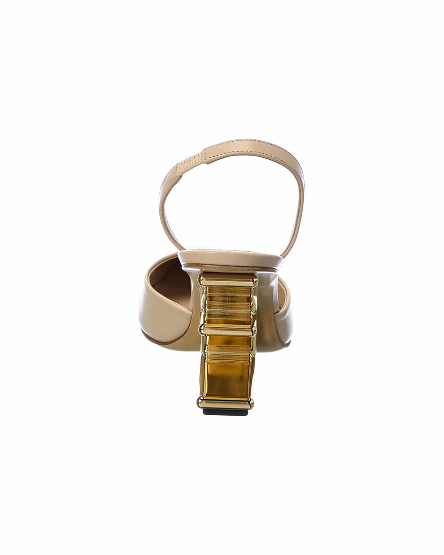 - First Leather Slingback Pump in pale pink leather and gold-tone hardware with logo heel