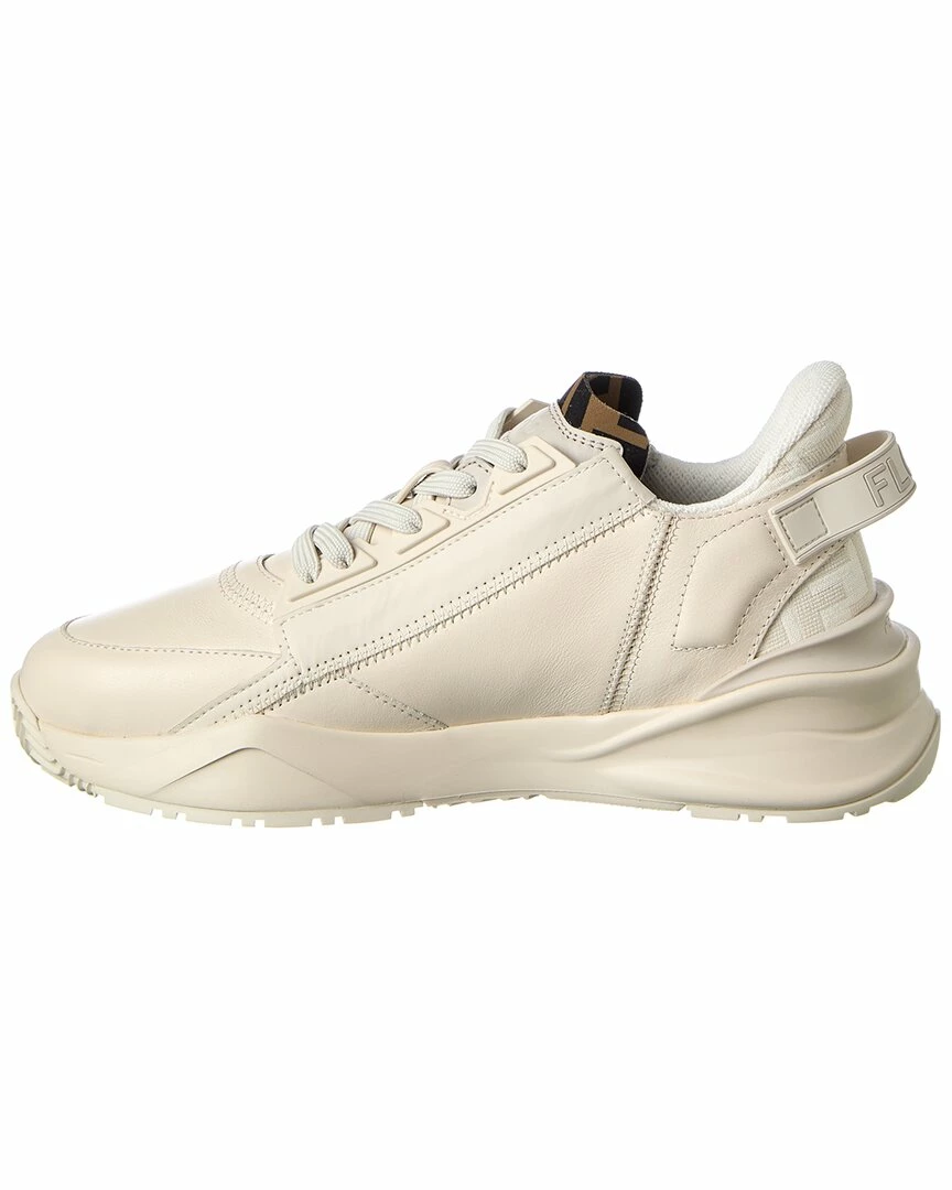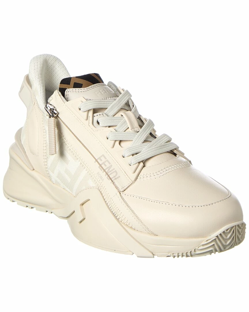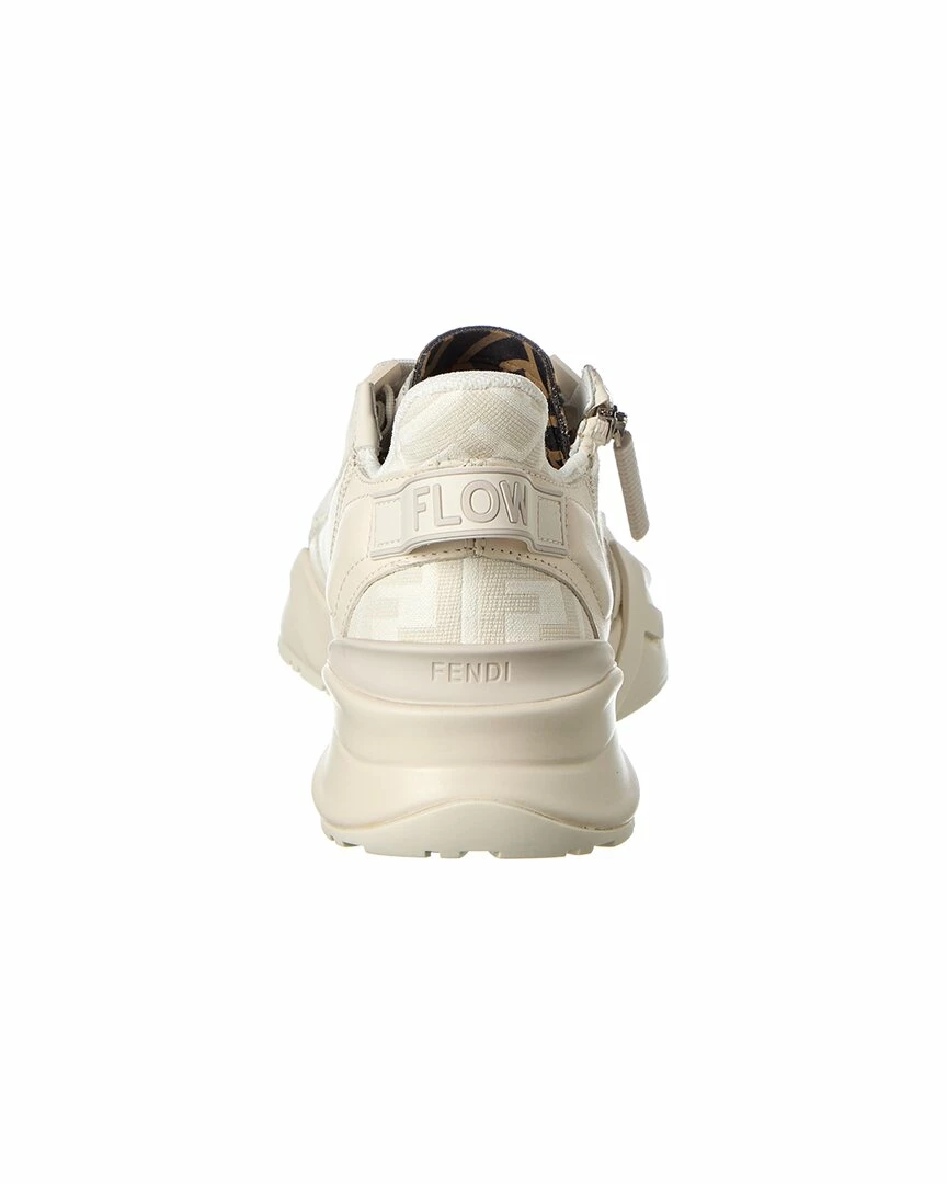 - Flow Leather Sneaker in white leather and FF motif fabric and silver-tone hardware with zipper accent and logo strap at back