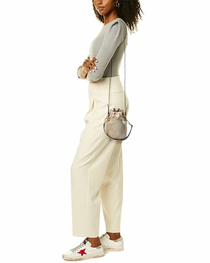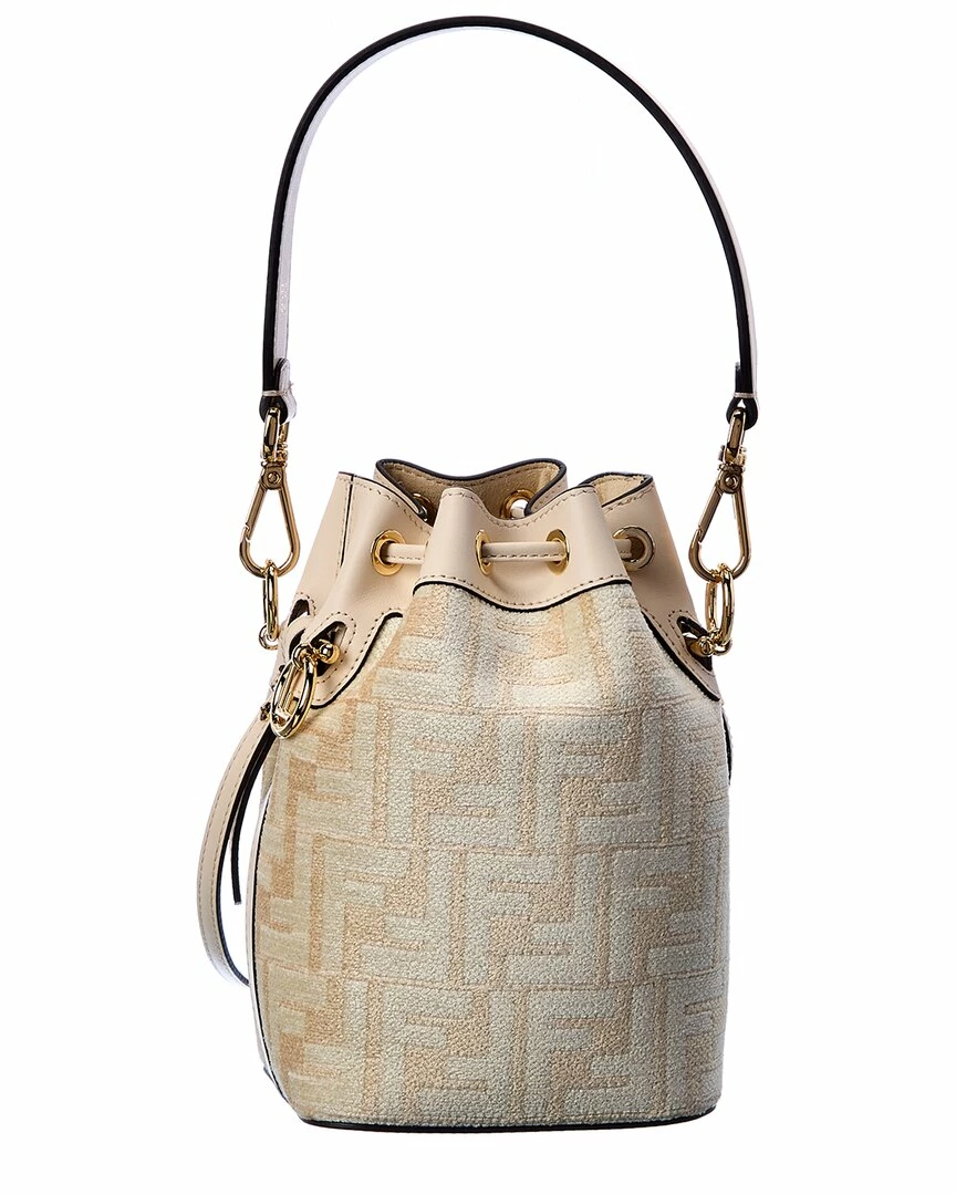 - Mon Tresor Mini FF Tapestry & Leather Bucket Bag in white FF tapestry chenille and leather with gold-tone hardware and logo charm detailing