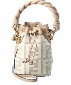 - Mon Tresor Mini FF Canvas & Leather Bucket Bag in white FF canvas and leather with gold-tone hardware, braided handle and logo charm detailing