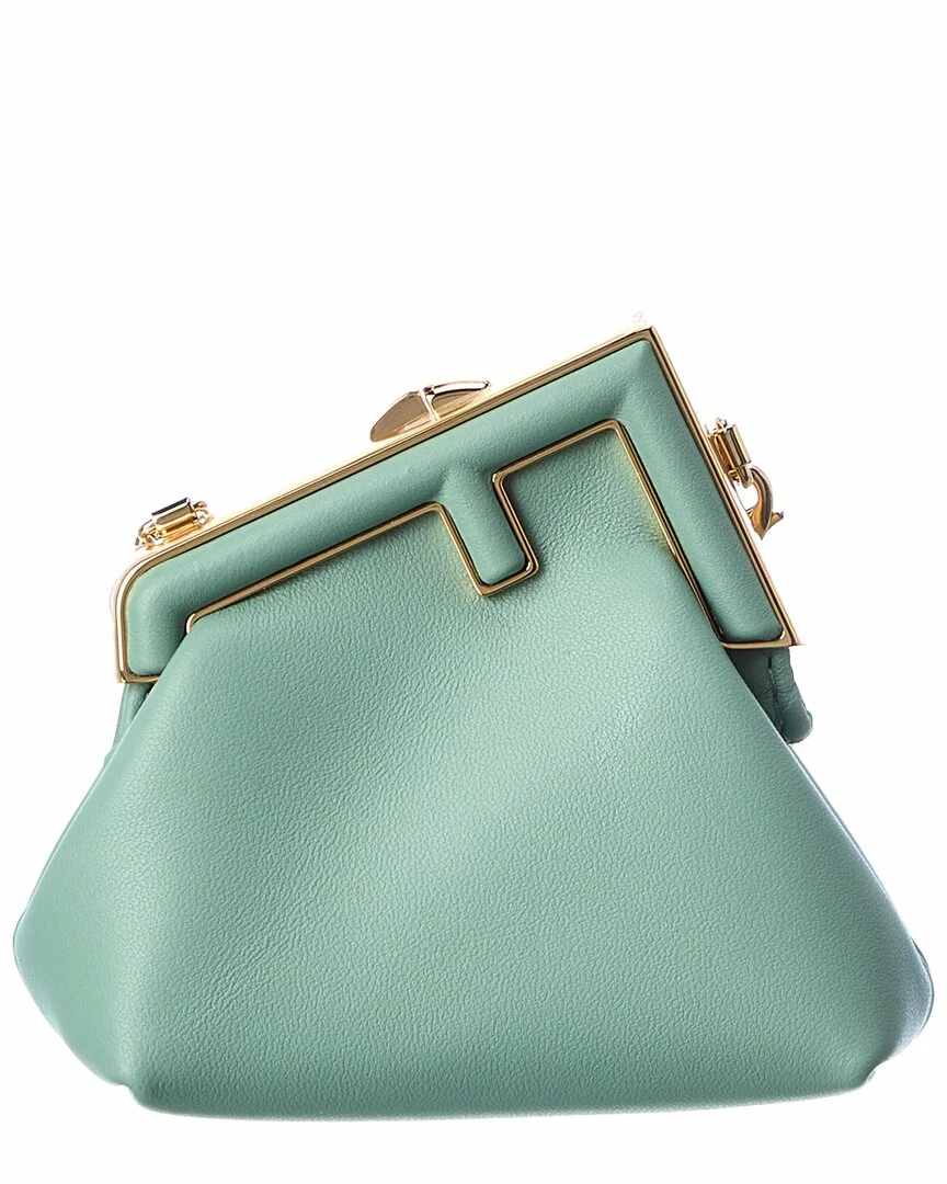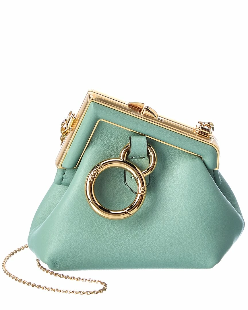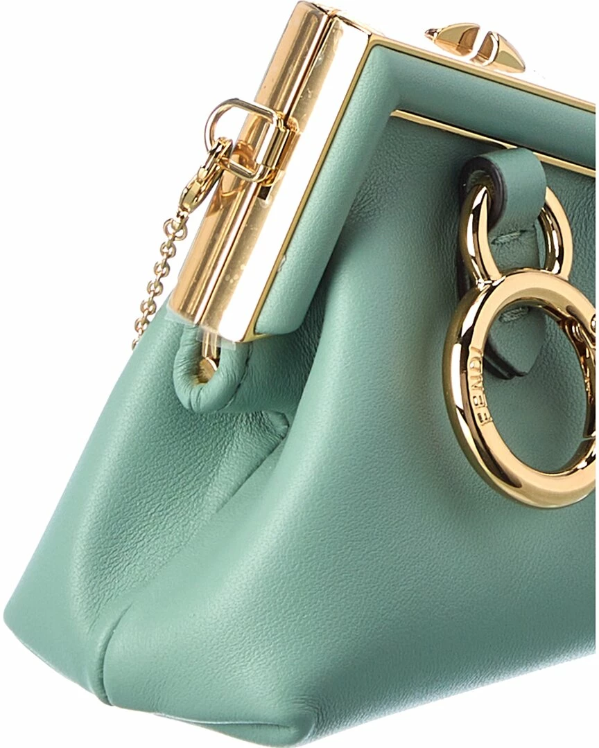 - Nano First Charm Leather Clutch in mint green leather and gold-tone hardware with ring accent and chain strap with adjustable slider