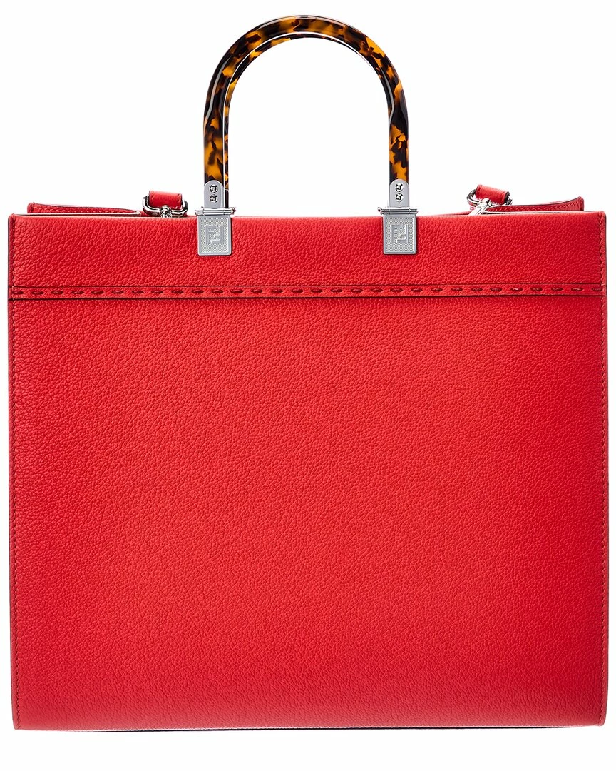 - Sunshine Medium Leather Tote in red leather with silver-tone hardware and plexiglass top handles