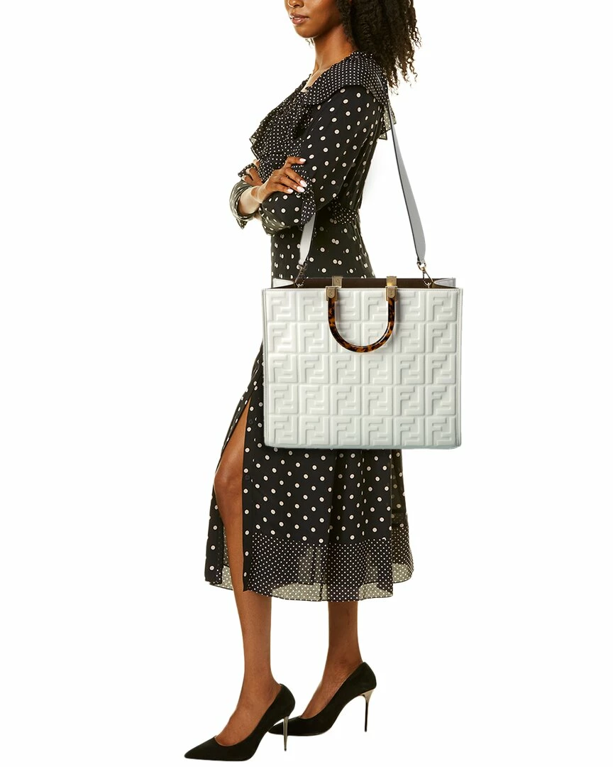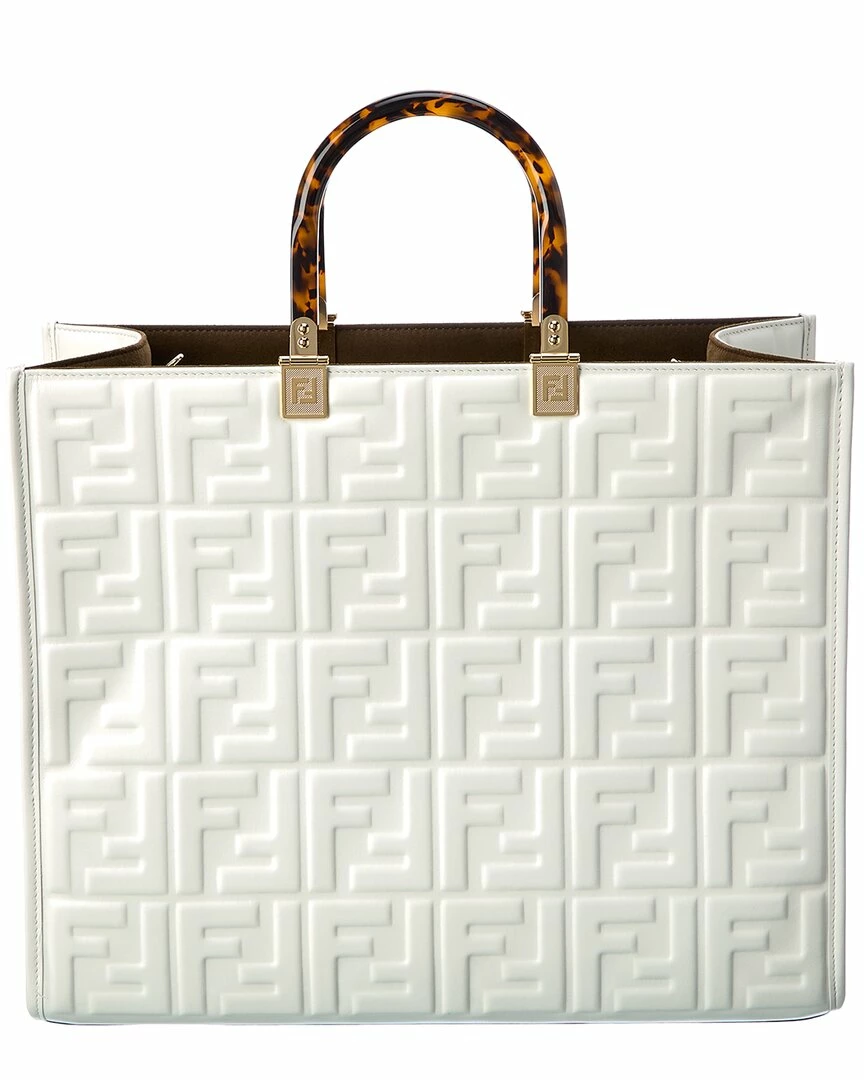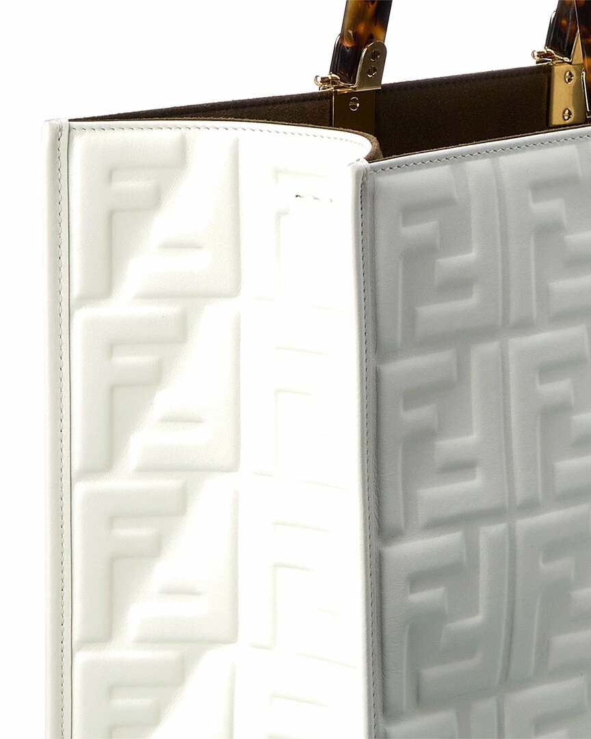 - Sunshine Medium Leather Tote in white FF motif leather with gold-tone hardware and plexiglass top handles