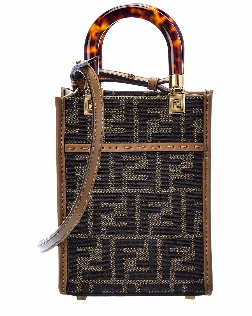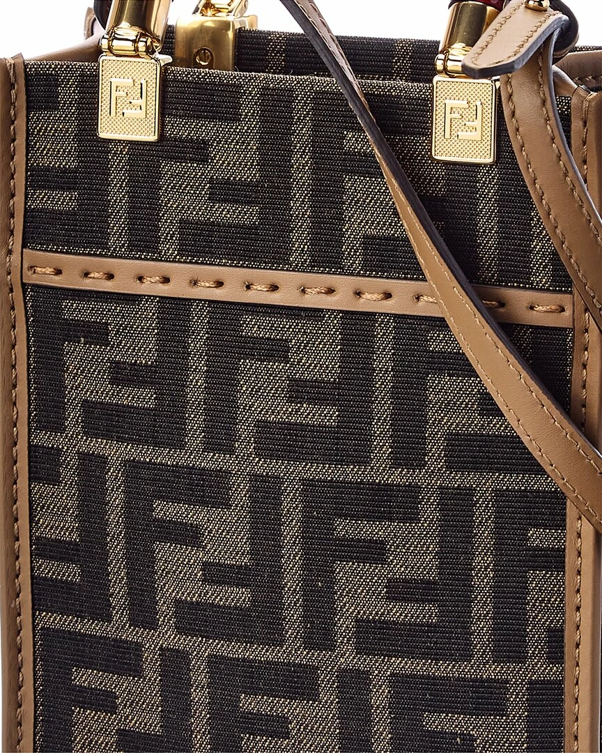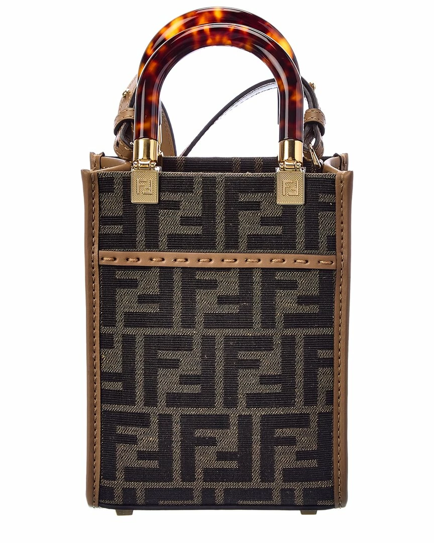 - Sunshine Mini FF Jacquard & Leather Tote in brown FF jacquard fabric and leather with gold-tone hardware and Plexiglas top handles
