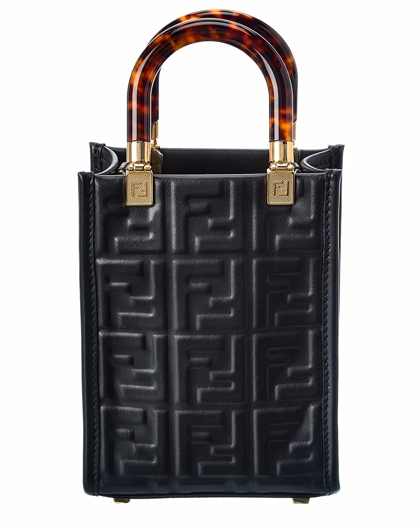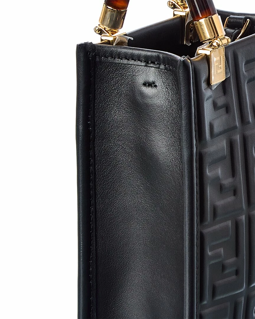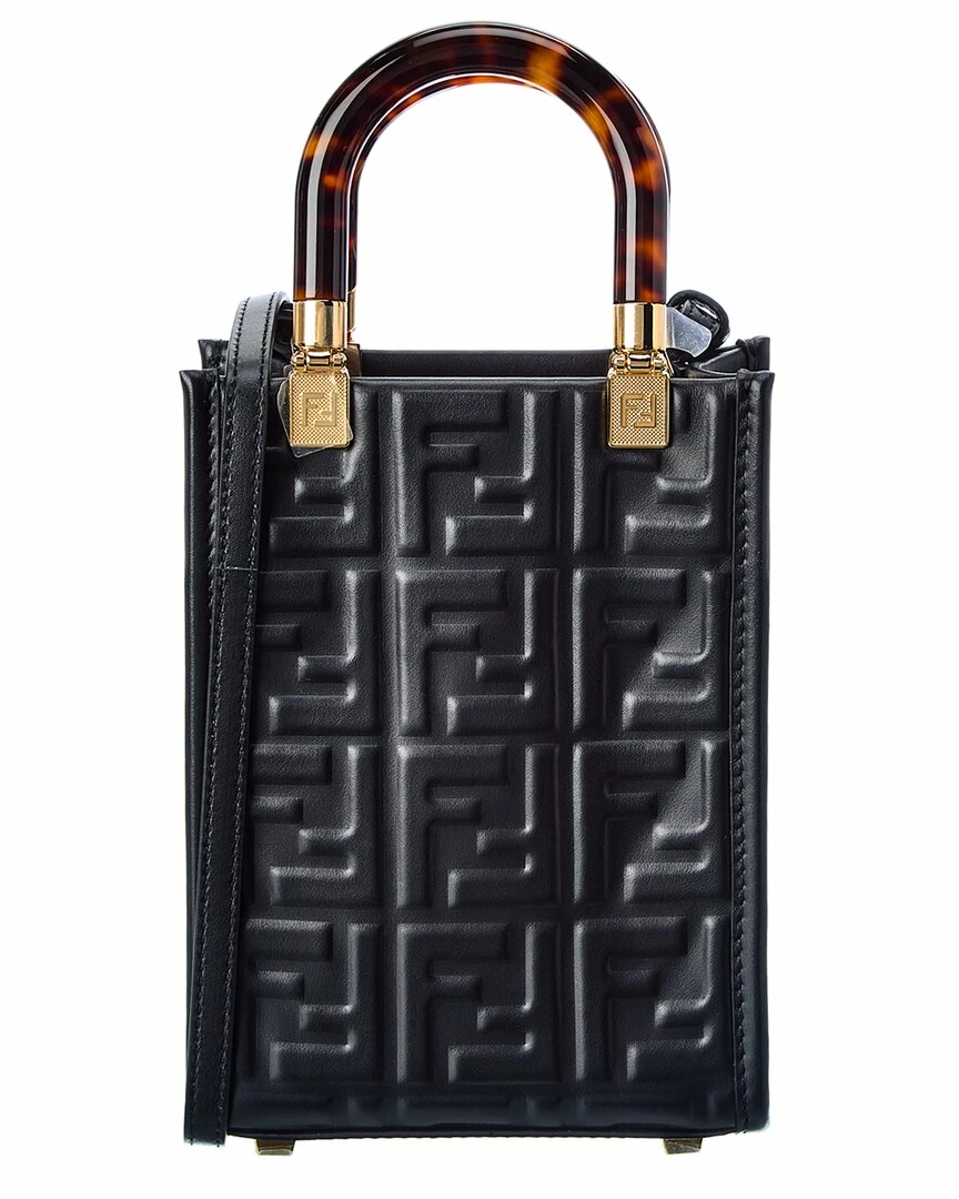 - Sunshine Mini Leather Tote in black FF motif leather with gold-tone hardware and Plexiglas top handles